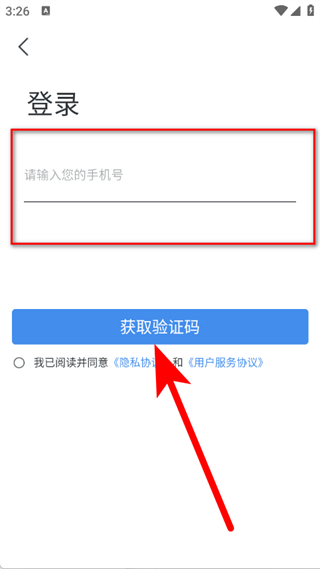 3、輸入手機號碼,勾選同意相關(guān)協(xié)議后,點擊獲取驗證碼。
