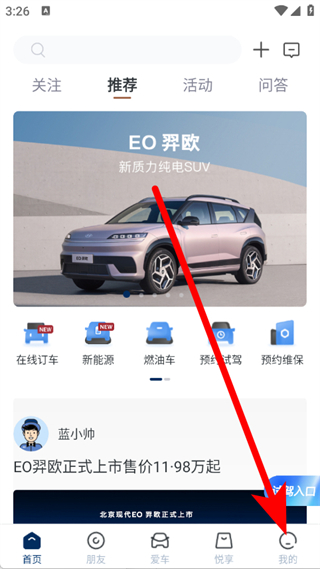1、打開北京現(xiàn)代汽車,點擊底部導(dǎo)航欄我的,進入個人頁面。