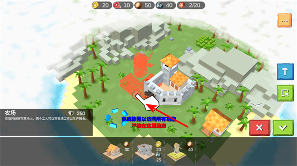 2、放置建筑時(shí),按照提示拖放建筑到合適區(qū)域,完成放置后可解鎖建筑的功能,如農(nóng)場(chǎng)可生產(chǎn)糧食資源,助力島嶼的生存和發(fā)展。