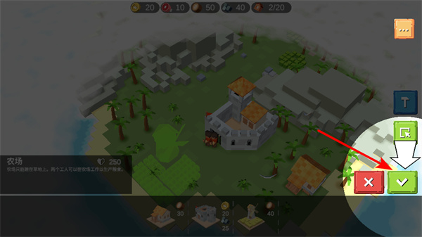 3、在建筑放置確認(rèn)界面,點(diǎn)擊綠色對(duì)勾按鈕可確認(rèn)建筑的放置,若放置位置不合適,可點(diǎn)擊紅色叉號(hào)按鈕重新調(diào)整,確保布局合理。