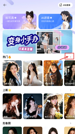 2、在寫真風(fēng)格選擇頁面,點(diǎn)擊熱門分類的更多按鈕,查看熱門寫真風(fēng)格列表。