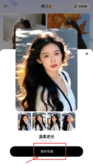 4、在風(fēng)格詳情頁,點(diǎn)擊制作寫真按鈕,開始創(chuàng)作溫柔逆光風(fēng)格寫真。