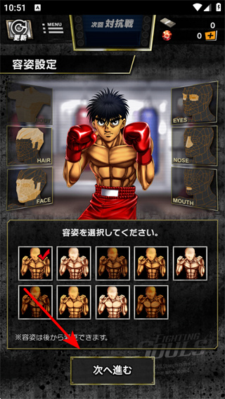2、在角色容貌設(shè)定界面,選擇心儀的發(fā)型、臉型等容貌選項(xiàng),打造專屬拳擊手形象,完成后點(diǎn)擊,推進(jìn)流程。