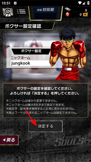 3、在拳擊手設(shè)定確認(rèn)界面,檢查昵稱等信息無(wú)誤后,點(diǎn)擊確定,完成拳擊手的創(chuàng)建,正式進(jìn)入游戲世界。