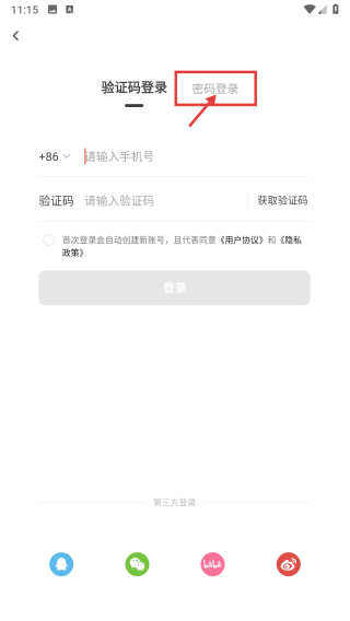 3、在登錄方式選擇頁面,點擊密碼登錄選項,進入密碼登錄信息填寫頁面。