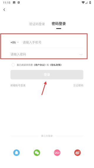 4、在密碼登錄頁面,填寫手機號及密碼,勾選同意協(xié)議后點擊登錄按鈕,完成賬號登錄操作。