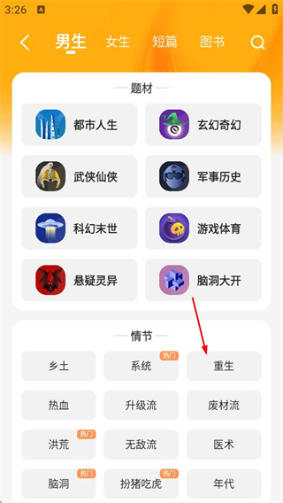 2、在分類頁面,選擇重生情節(jié)分類,進(jìn)入重生小說列表頁面。