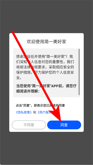 1、打開簡一美好家,在隱私協(xié)議彈窗中,點擊同意。