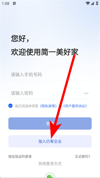 2、在登錄頁面,點擊加入已有企業(yè),進入頁面。