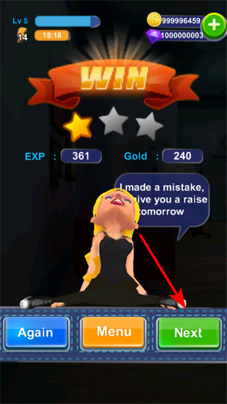 4、關(guān)卡勝利后,點擊Next按鈕進入下一關(guān),進入下一關(guān)可挑戰(zhàn)更難的戰(zhàn)斗場景,不斷提升角色戰(zhàn)力。