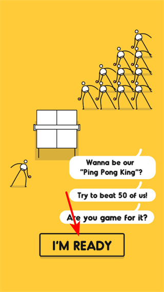 1、在游戲中點擊I’M READY按鈕開啟乒乓球挑戰(zhàn),這是參與擊敗50人成為乒乓之王挑戰(zhàn)關鍵操作,進入對戰(zhàn)環(huán)節(jié)。