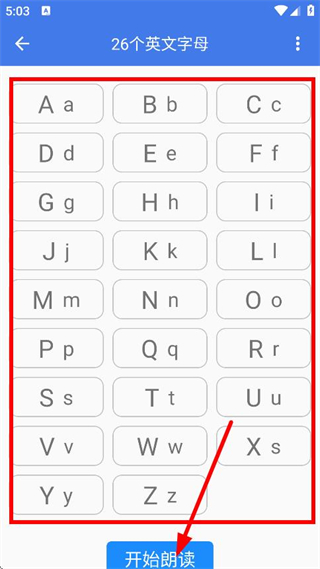 4、在26個(gè)英文字母頁(yè)面,點(diǎn)擊開(kāi)始朗讀,開(kāi)始學(xué)習(xí)英文字母。