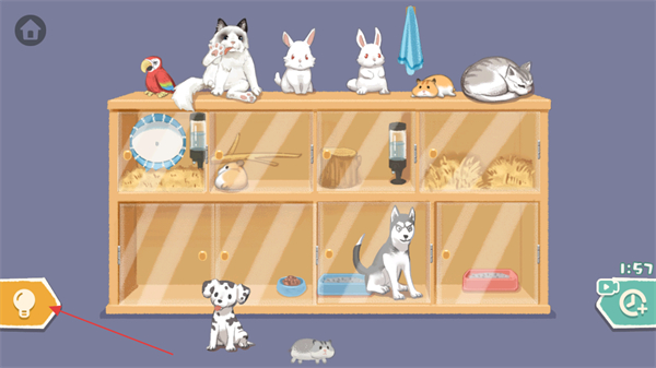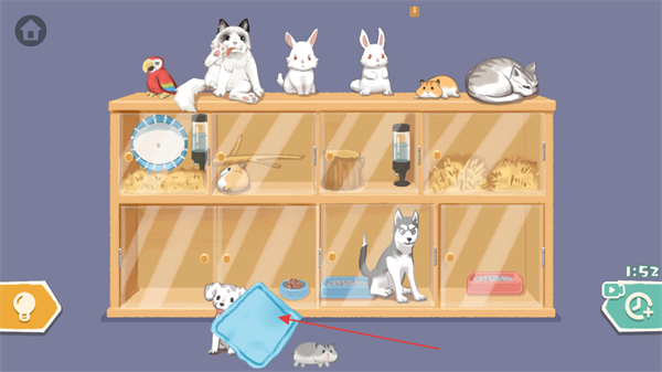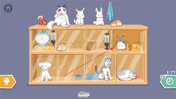 4、將倉鼠等小動物放置到對應的收納格中,整理好所有寵物,完成收納任務。