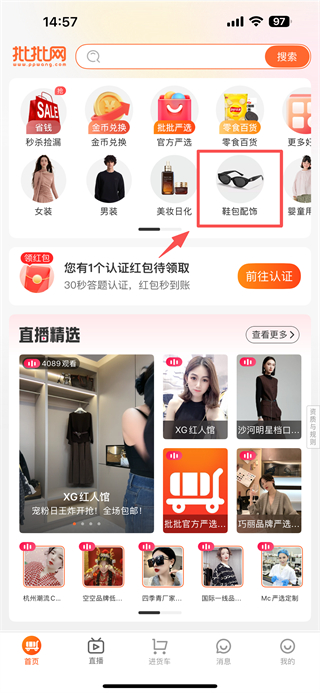 1、打開(kāi)電商類APP,點(diǎn)擊鞋包配飾分類標(biāo)簽,進(jìn)入鞋包配飾商品專區(qū)。