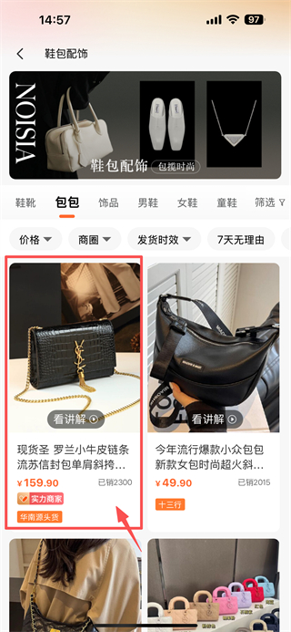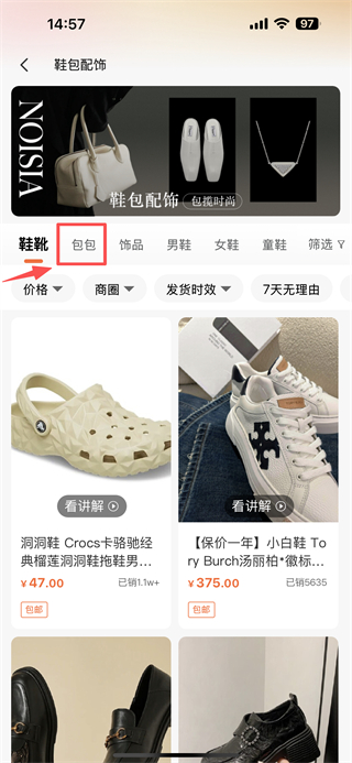 2、在鞋包配飾商品專區(qū),點(diǎn)擊包包類目,進(jìn)入包包商品列表頁(yè)。