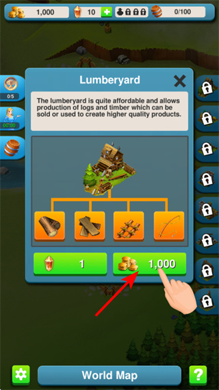 2、選擇金幣支付方式購買建筑,建筑購買是開展經(jīng)營的核心步驟,購買后可擁有伐木場,開始生產(chǎn)木材等資源,積累經(jīng)營資本。