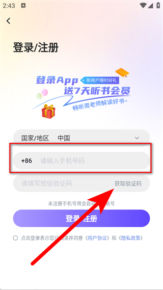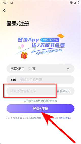 4、輸入收到的驗證碼,勾選后,點擊登錄注冊按鈕,完成賬號登錄。