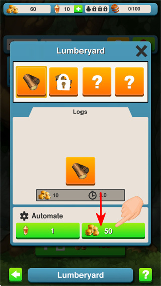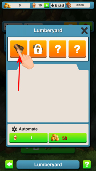 4、點(diǎn)擊金幣按鈕進(jìn)行生產(chǎn)自動(dòng)化,自動(dòng)化設(shè)置是提升效率的重要操作,設(shè)置后可讓伐木場(chǎng)自動(dòng)生產(chǎn),即可持續(xù)獲取資源。