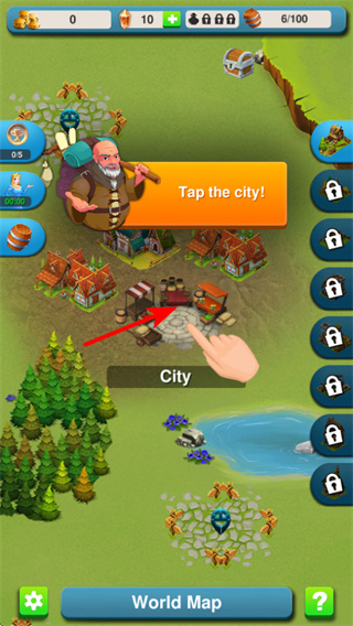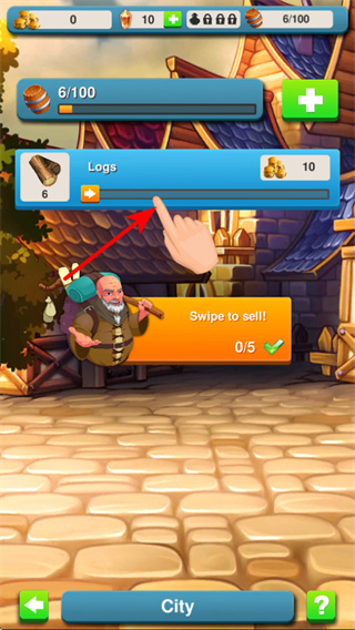 2、點(diǎn)擊City區(qū)域進(jìn)入交易市場(chǎng),市場(chǎng)進(jìn)入是實(shí)現(xiàn)收益的核心步驟,進(jìn)入后可將生產(chǎn)的木材等資源進(jìn)行售賣,積累經(jīng)營(yíng)資金。
