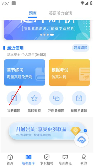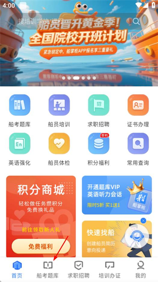 1、在船掌柜首頁(yè),點(diǎn)擊船考題庫(kù)選項(xiàng),進(jìn)入題庫(kù)頁(yè)面。