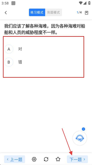 5、在題目練習(xí)頁(yè)面,完成當(dāng)前題目作答后點(diǎn)擊下一題按鈕,可繼續(xù)練習(xí)下一道題目。