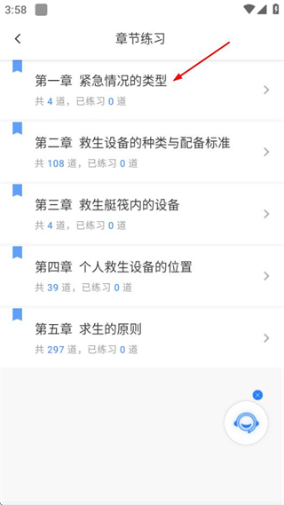 4、在章節(jié)選擇頁(yè)面,選擇要練習(xí)的章節(jié),如“第一章 緊急情況的類(lèi)型”,進(jìn)入題目練習(xí)頁(yè)面。
