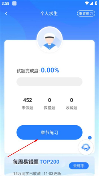 2、在題庫(kù)頁(yè)面,點(diǎn)擊章節(jié)練習(xí)選項(xiàng),進(jìn)入個(gè)人求生練習(xí)頁(yè)面。