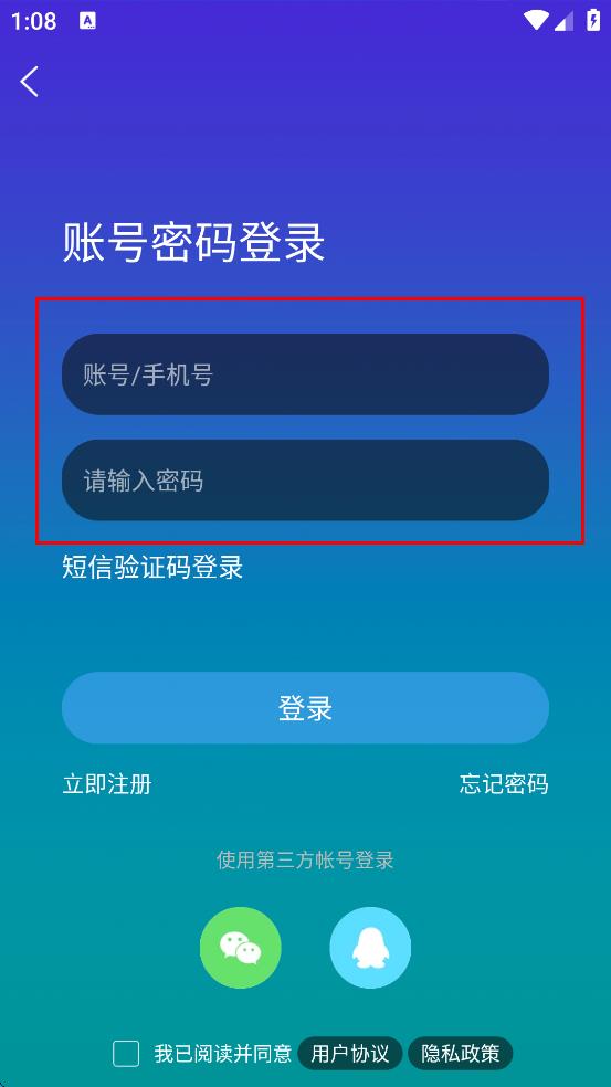3、在賬號密碼登錄頁面,輸入賬號或手機號,再輸入密碼。