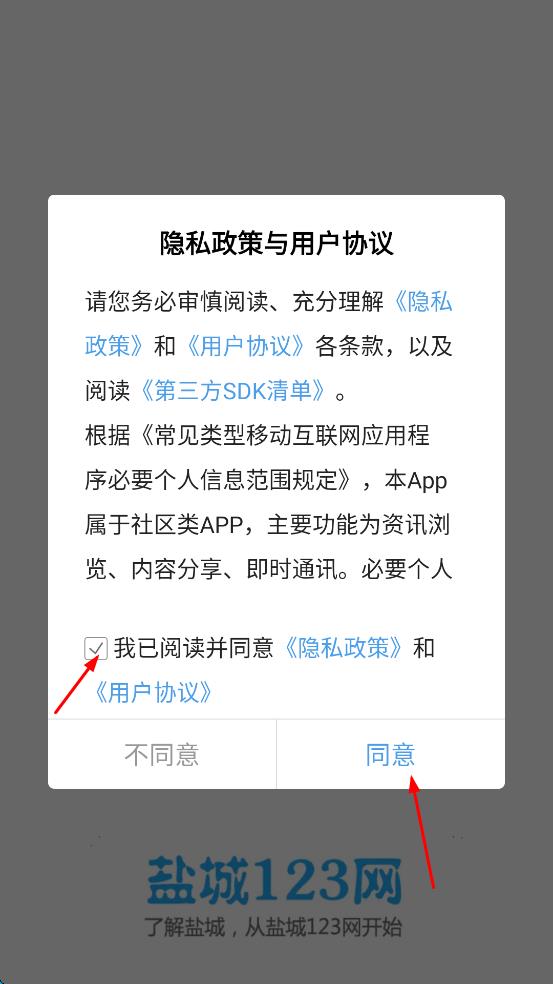 1、打開鹽城123網(wǎng),會出現(xiàn)隱私政策與用戶協(xié)議界面,勾選我已閱讀并同意隱私政策和用戶協(xié)議,點擊“同意”,進入動態(tài)頁面。