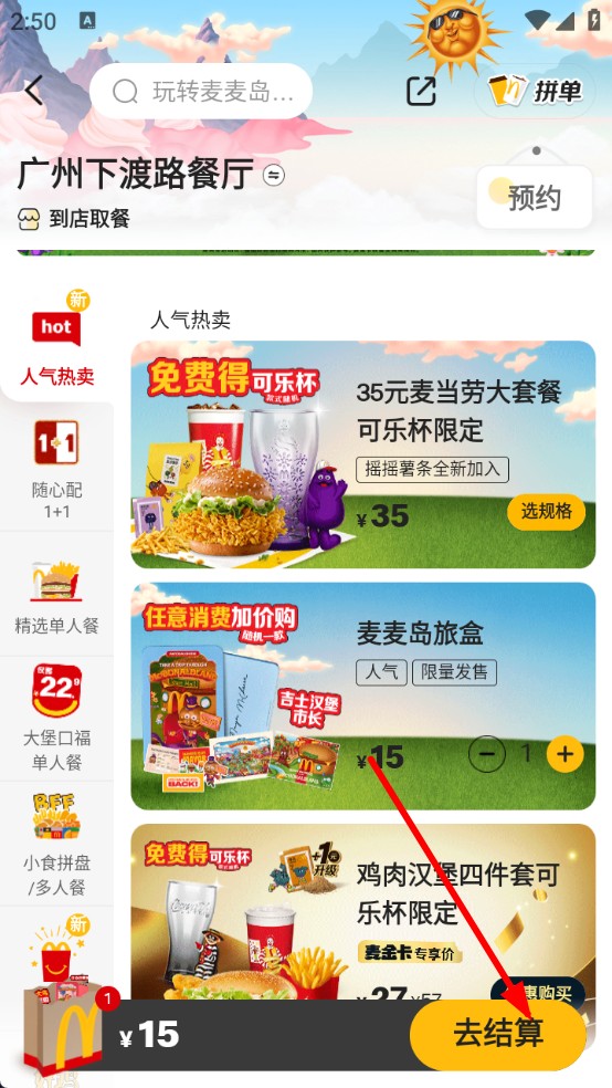 1、打開麥當(dāng)勞APP點(diǎn)餐界面,選好要預(yù)約的早餐餐品,點(diǎn)擊去結(jié)算。