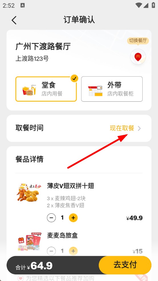 2、在訂單確認(rèn)頁,點(diǎn)擊取餐時間選項(xiàng),進(jìn)入取餐時間設(shè)置環(huán)節(jié)。