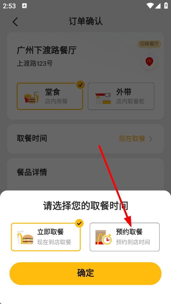 3、彈出取餐時間選擇框后,點(diǎn)擊預(yù)約取餐選項(xiàng),切換到預(yù)約模式。