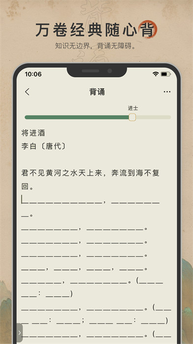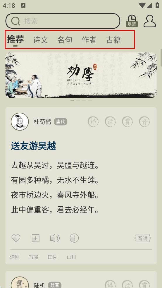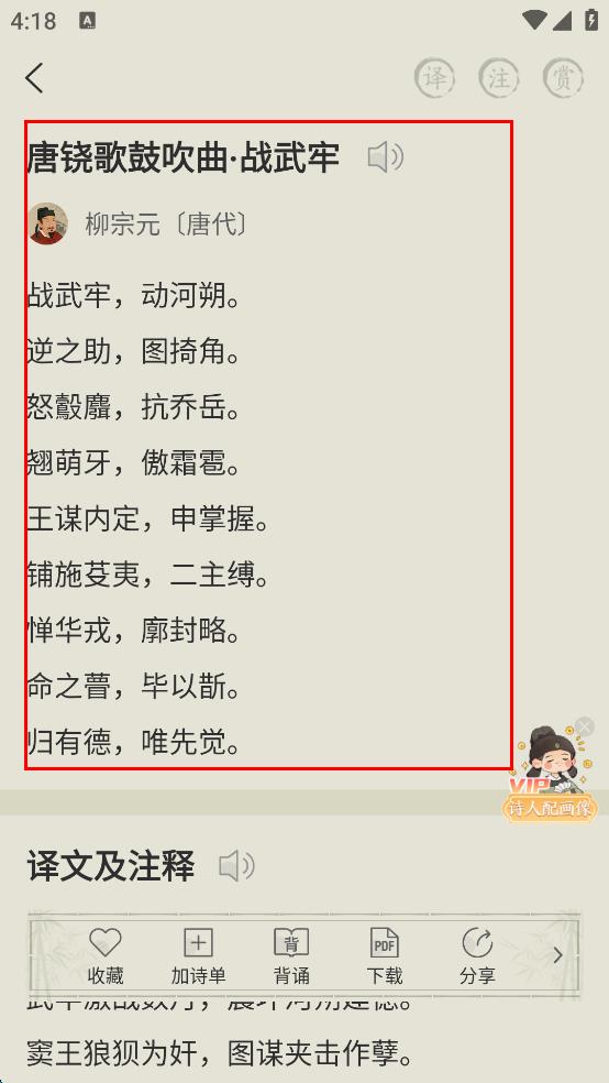 4、點(diǎn)擊詩(shī)文后,進(jìn)入詩(shī)文詳情界面,可查看詩(shī)文的完整內(nèi)容,還有“譯文及注釋”板塊,以及“收藏”“加詩(shī)單”“背誦”等功能選項(xiàng),盡情了解詩(shī)文信息。