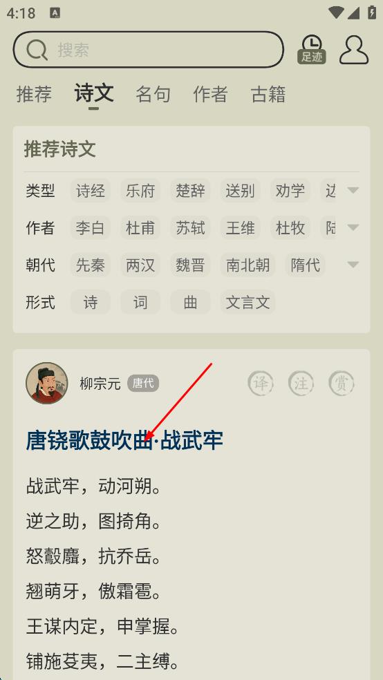 3、進(jìn)入詩(shī)文界面,界面有“推薦詩(shī)文”板塊,可按類(lèi)型、作者、朝代、形式篩選,找到想要查看詳情的詩(shī)文,比如唐鐃歌鼓吹曲·戰(zhàn)武牢,點(diǎn)擊該詩(shī)文。