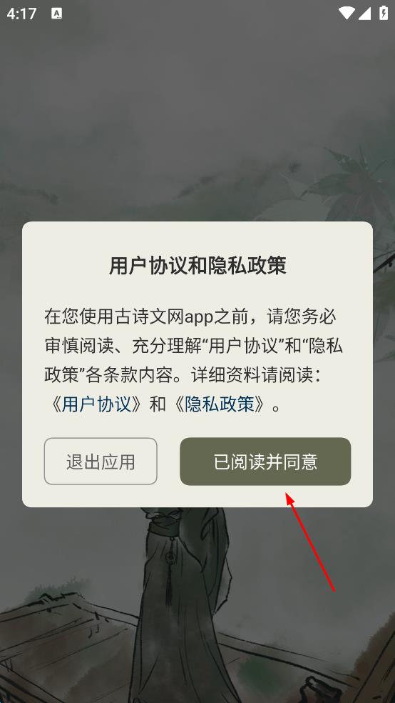 1、打開(kāi)古詩(shī)文網(wǎng),進(jìn)入用戶(hù)協(xié)議和隱私政策界面,界面說(shuō)明使用前需審慎閱讀、充分理解“用戶(hù)協(xié)議”和“隱私政策”各條款內(nèi)容,點(diǎn)擊“已閱讀并同意”按鈕。