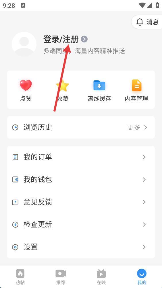 1、打開影視大全,點(diǎn)擊我的,進(jìn)入個(gè)人中心頁面,點(diǎn)擊登錄/注冊選項(xiàng)。