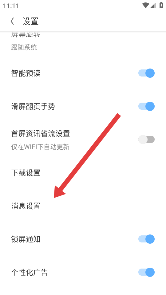 2、在設(shè)置界面中,滑動查找功能列表,點擊消息設(shè)置選項,進(jìn)入消息通知專屬設(shè)置頁面。