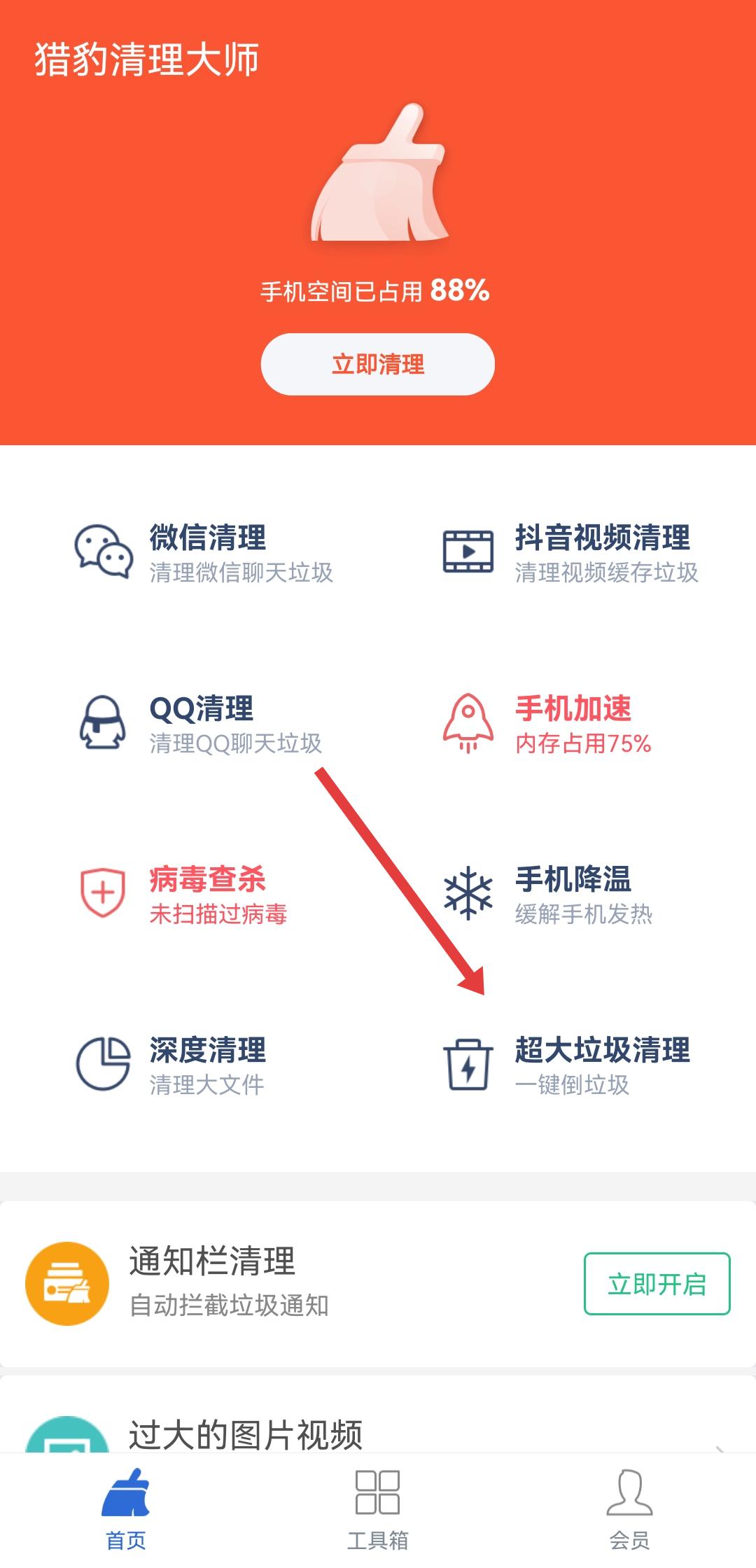 1、打開獵豹清理大師APP,在首頁(yè)功能區(qū)點(diǎn)擊超大垃圾清理選項(xiàng),進(jìn)入垃圾掃描的界面。