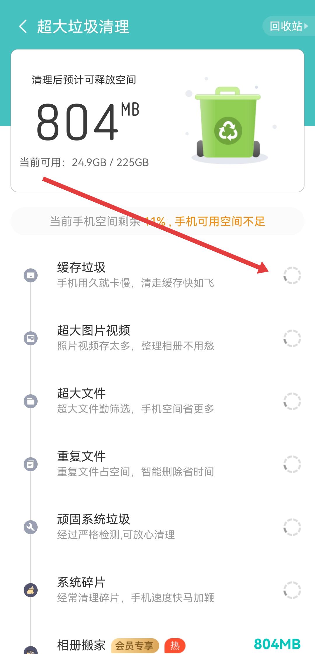 2、等待系統(tǒng)自動(dòng)掃描手機(jī)中的緩存垃圾、超大圖片視頻、超大文件等內(nèi)容,界面顯示清理后預(yù)計(jì)可釋放空間。