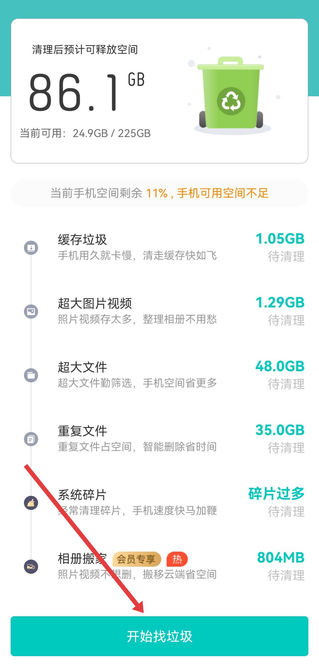 3、掃描完成后,點(diǎn)擊底部開始找垃圾或?qū)?yīng)清理按鈕,按照提示完成垃圾清理操作。