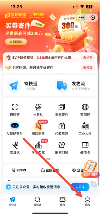 1、打開(kāi)德邦快遞APP,進(jìn)入首頁(yè)后點(diǎn)擊底部導(dǎo)航欄中我的選項(xiàng)。