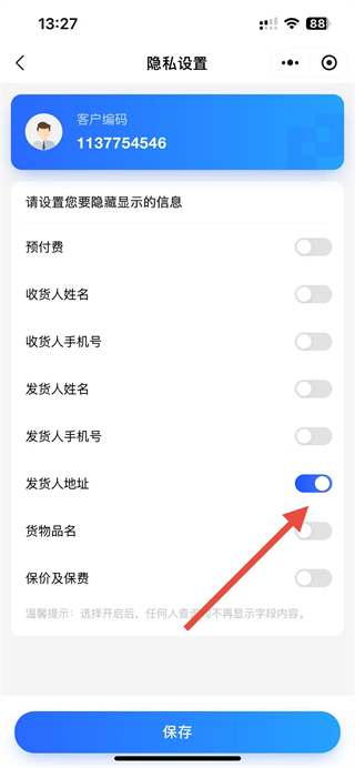 4、點(diǎn)擊開(kāi)啟發(fā)貨人地址隱藏開(kāi)關(guān)后,即可完成地址信息隱藏設(shè)置。