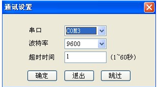 4.在“通訊設(shè)置”里選擇相應(yīng)的端口,波特率選為“9600”,超時時間最好選擇1~5秒左右,如下圖: