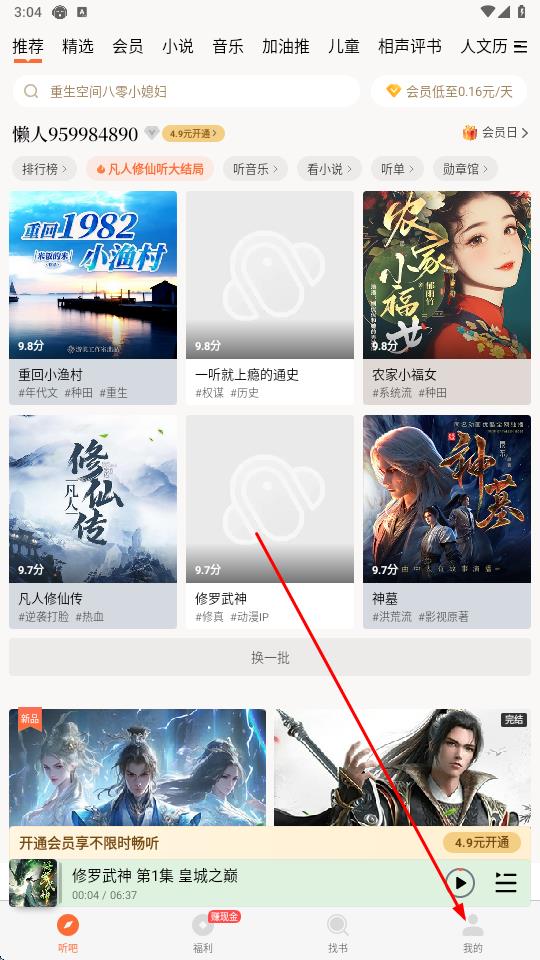 1、打開懶人聽書APP,點擊底部導(dǎo)航欄最右側(cè)【我的】按鈕,進(jìn)入個人中心頁面。