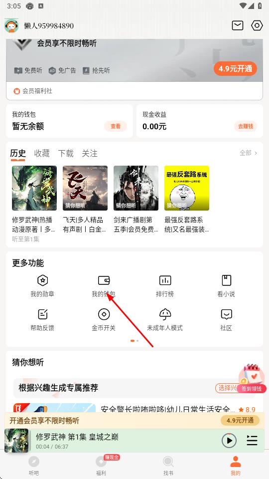 2、在個人中心頁面,找到【更多功能】板塊,點擊其中的【我的錢包】選項,進(jìn)入錢包管理界面。