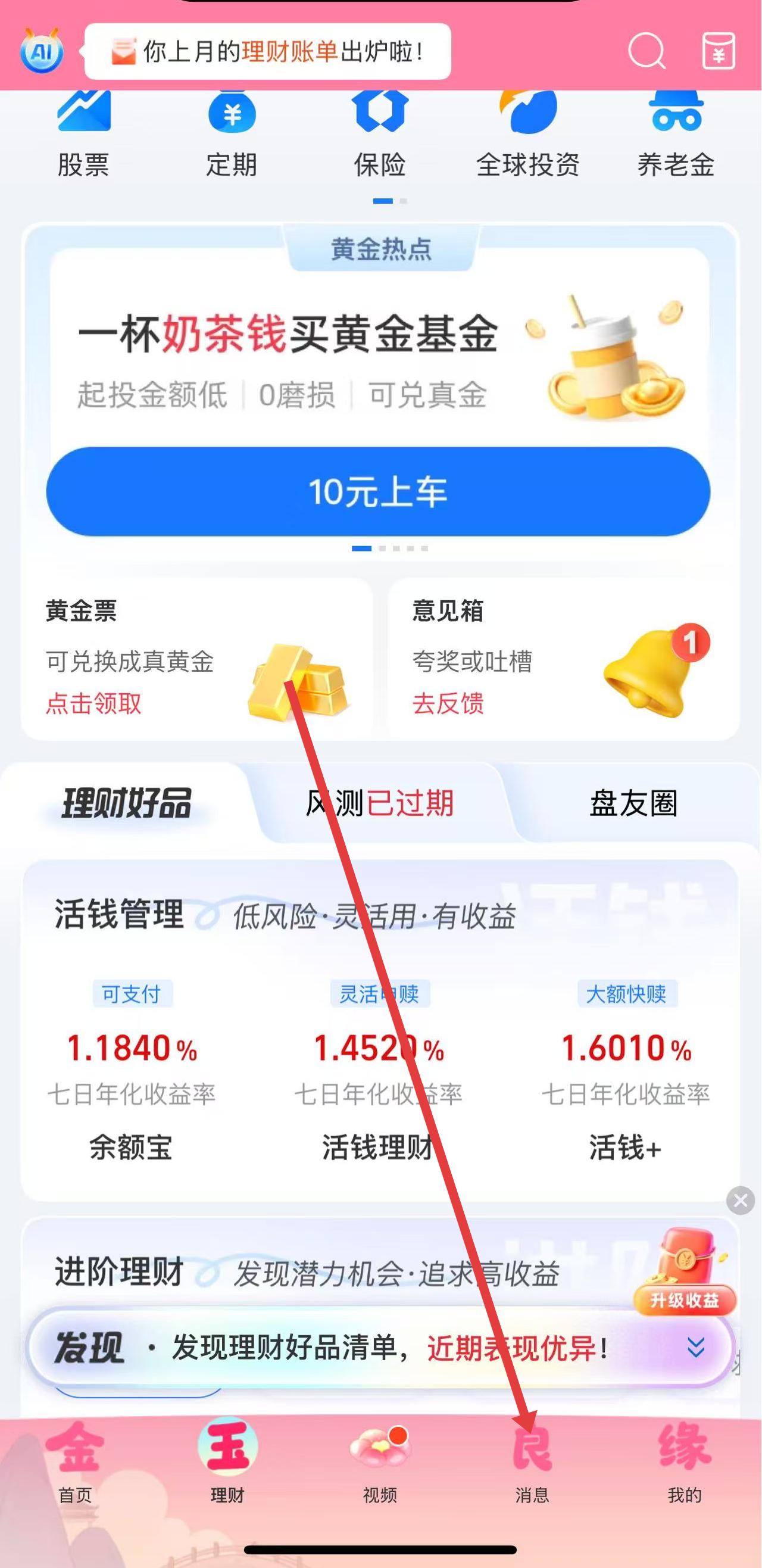 1、打開支付寶應用,點擊底部導航欄中的消息進入消息頁面。