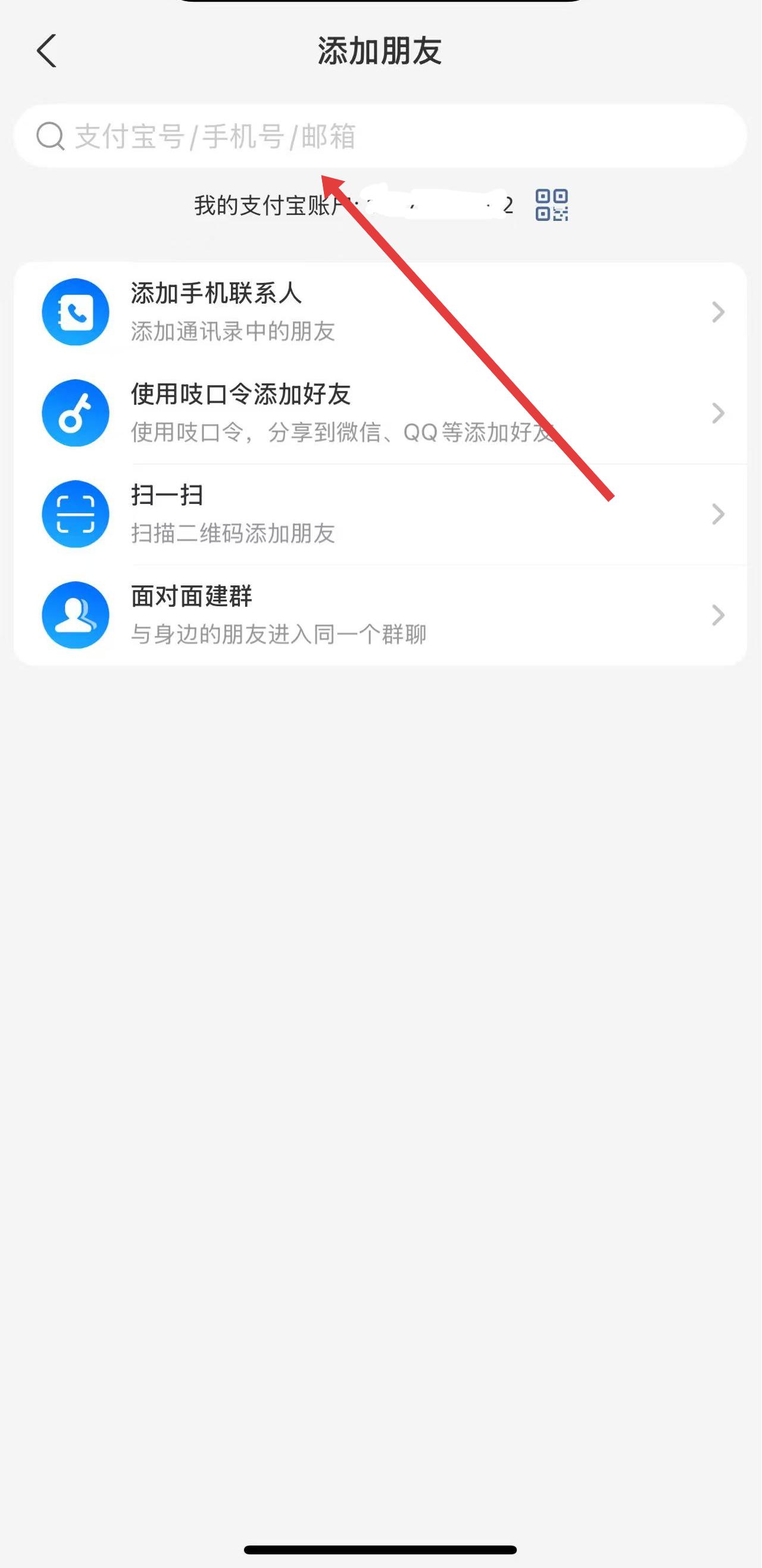 4、在添加朋友界面,可以通過輸入支付寶號、手機號、郵箱,或選擇添加手機聯(lián)系人、使用吱口令、掃碼等方式添加好友。