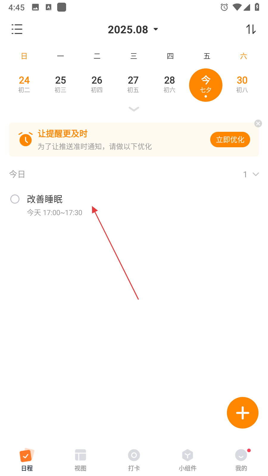 1、打開指尖時光應(yīng)用,點擊底部導(dǎo)航欄日程選項進入日程界面 ,在界面中找到需要刪除的日程條目,點擊該日程條目。
