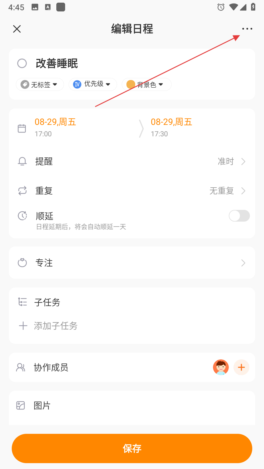 2、在編輯日程頁面的右上角,找到由三個點組成的更多功能圖標(biāo)并點擊。