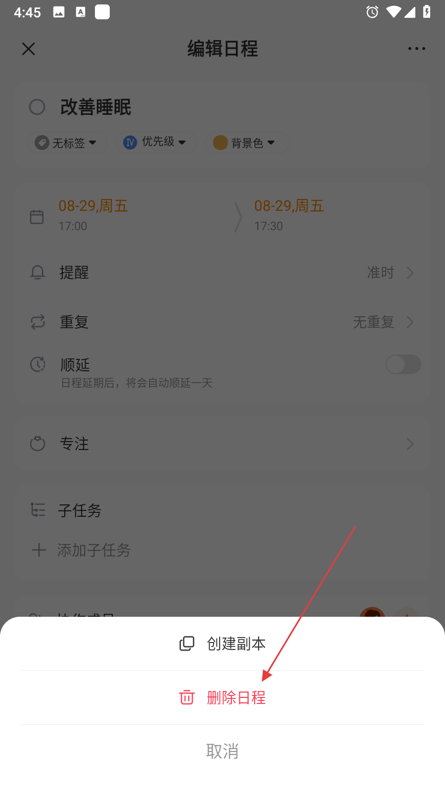 3、在彈出的菜單中,選擇刪除日程選項,系統(tǒng)會彈出確認(rèn)刪除的提示,確認(rèn)提示內(nèi)容后,點擊確認(rèn)按鈕。
